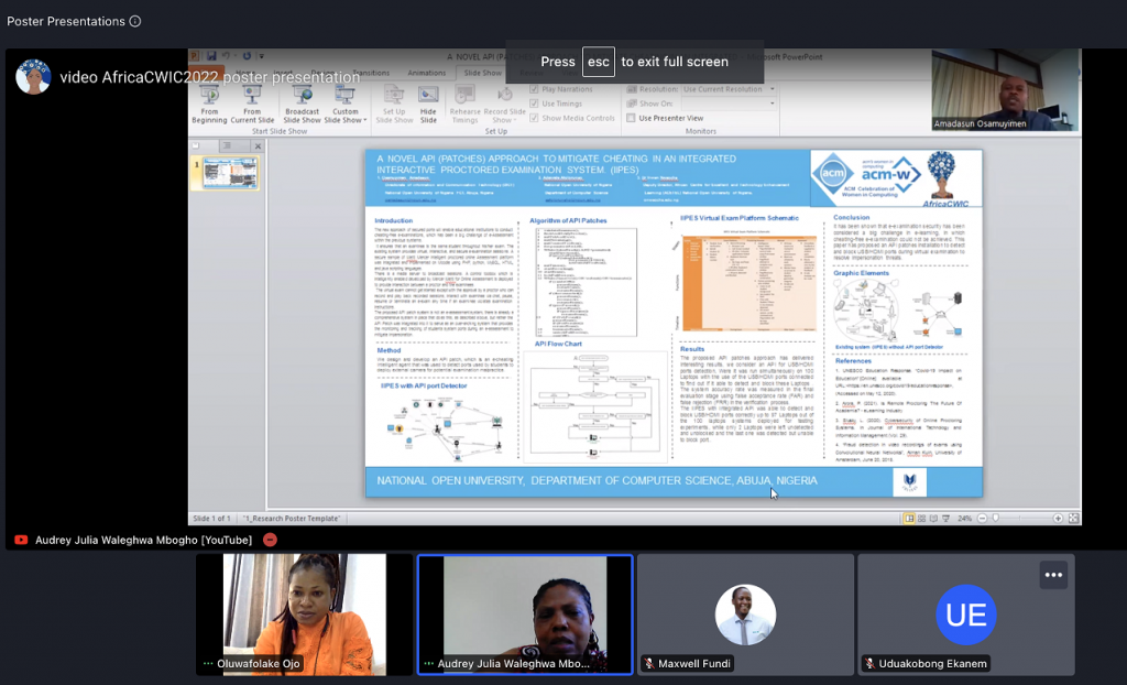 During the AfricaCWIC event we had a number of poster presenters, doctoral consortium presenters and a hackathon. Four workshops and two panels were also held. Our keynotes kept our audience captivated and our chairs Bukola Onashoga, Rosemary Quilling and Audrey Mbogho directed the conversation with ease. The ACM-W steering committee with Reyyan Ayfer, Ruth Lennona and Rukiye Altin are grateful to all of our participants from across the globe. Look at some of the wonderful things that happened at AfricaCWIC 2022.